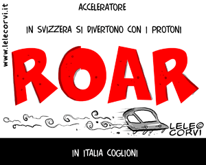 C’è qualcosa nel testo che rovina la vignetta. “Acceleratore. In Svizzera si divertono con i protoni. In Italia coglioni”. E’ un testo che – così come è – non significa molto.