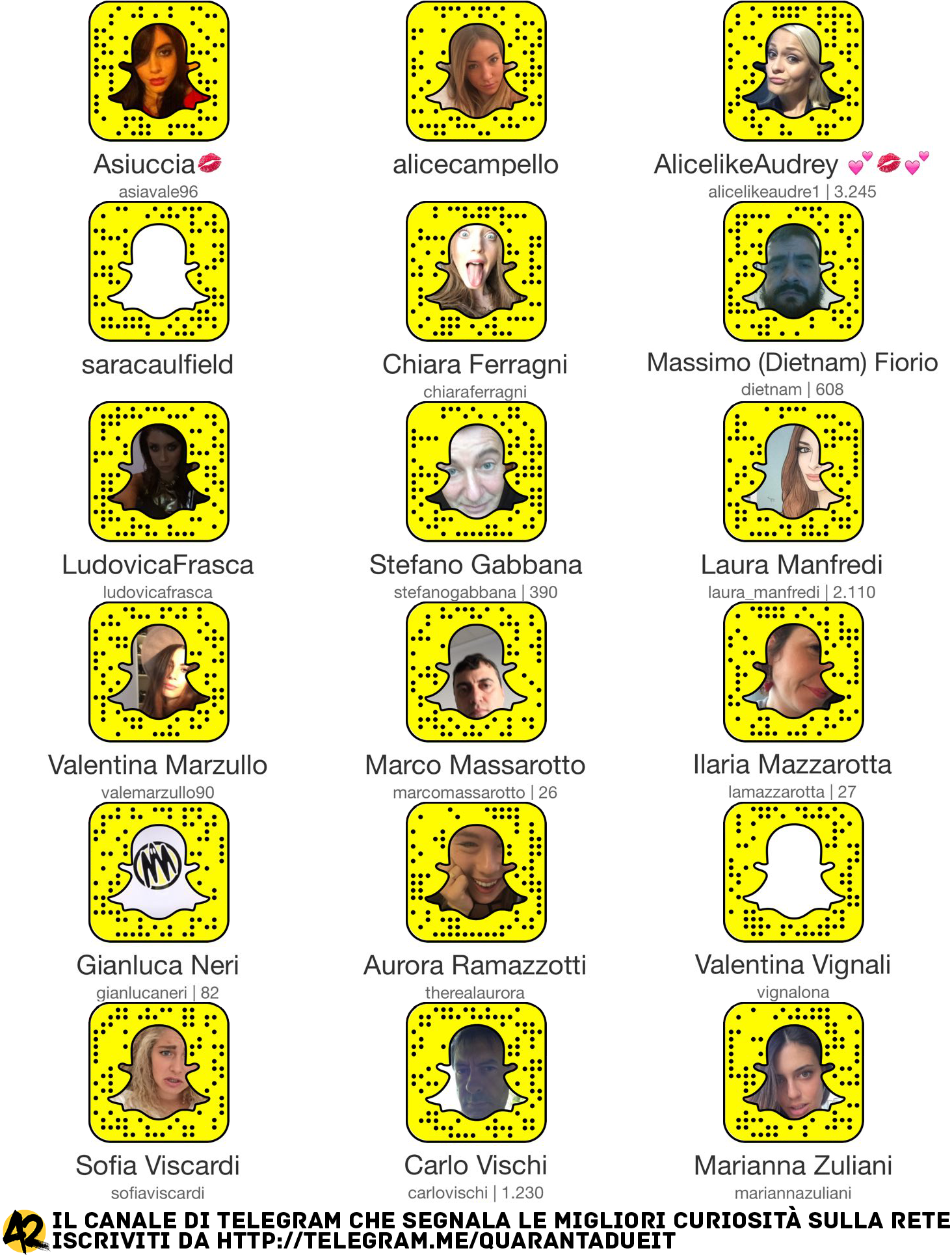 Ecco invece una (parziale) serie di “snapcodes” per iniziare a seguire un po’ di account *italiani* scelti tra spettacolo, moda, food e rete:
