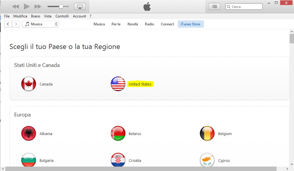 - Dalla schermata “Scegli il tuo paese o la regione” clicca su “United States” (figura 2).