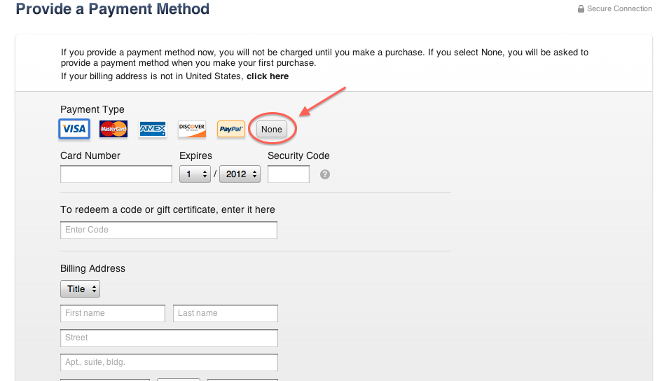- Quando ti verrà richiesto di inserire il numero della tua carta di credito scegli “None” (figura 4).