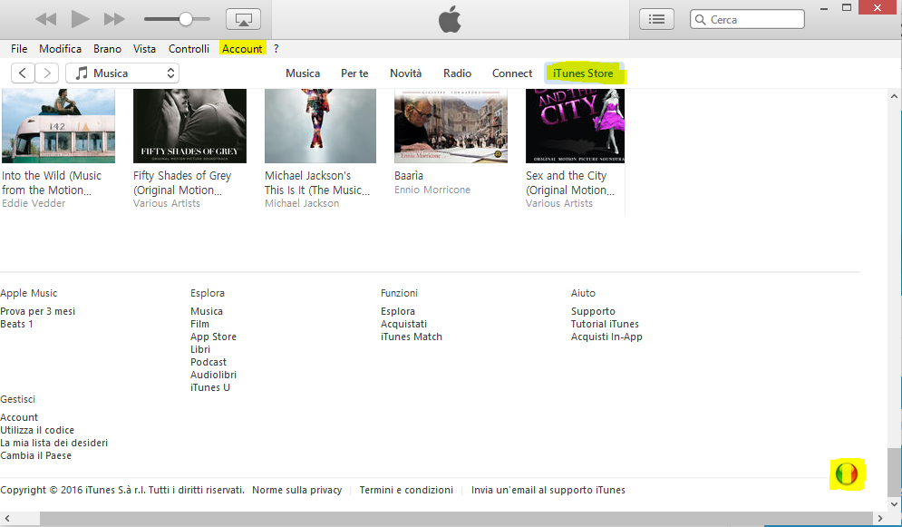 - Dalla seconda barra verticale in alto, clicca su “iTunes Store” e poi scorri la pagina in basso fino a che non vedi l’icona tonda della bandiera italiana (figura 1).