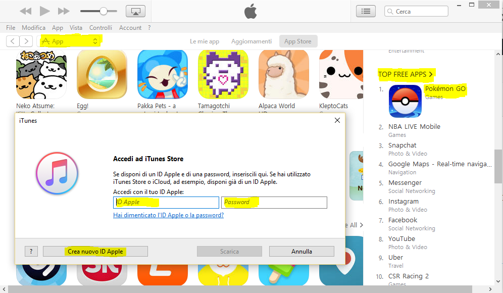 - Dal menu a tendina in alto scegli “App” poi, nella colonna a destra, vai alla prima delle “Top Free Apps”, clicca per scaricarla e, a quel punto, ti apparirà la finestra per creare un nuovo account Apple. Clicca sul pulsante “Crea nuovo account Apple” (figura 3).